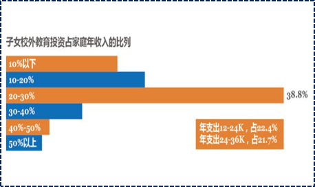 “我算了一下,花在孩子补课和兴趣培养上的前已经超过其他生活日常开支,每年至少增加20%,而我的工资确没怎么动。”一位受访家长表示。前程无忧《2019国内家庭子女教育投入调查》数据显示,家庭子女教育年支出主要集中在12,000-24,000元和24,000-36,000元两个范围内,占比分别为22.4%和21.7%。38.8%的受访家庭用于子女教育的投入占家庭年收入的2-3成,其次为22.9%的受访家庭占1-2成,且子女处于“学龄前及初中阶段”的家庭教育投入最高,呈现子女越低龄支出越高的趋势。接近6成的家庭为子女报读的课外学习班学费在100-200元/时。