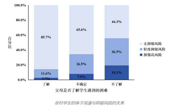 亲子沟通是父母提供有效支持的重要基础。报告指出,当学生认为父母不了解自己遇到的困难时,抑郁风险较高,其抑郁高风险检出率为认为父母了解自己遇到的困难的学生这一组的7倍。