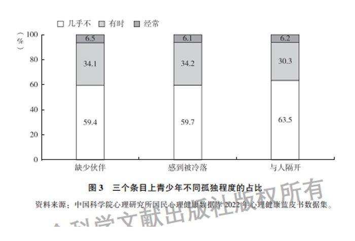 孤独是衡量心理健康的重要指标,是个体社会关系得不到满足时产生的负性情绪体验。总体上四成左右的青少年有时或经常感到缺少伙伴、被冷落或与别人是隔绝的。