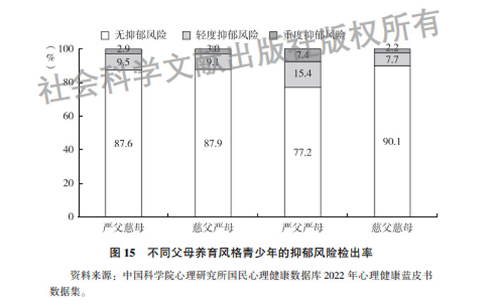 进一步从个人因素、家庭因素和社会环境因素对青少年心理健康的影响因素进行的分析表明,内在状态不佳,如低生命意义感、高空虚感与青少年更高的抑郁、孤独和手机成瘾相关;相对同龄人,青春期过早或过晚启动都可能对心理健康产生负面影响。家庭社会经济地位、家庭结构、父母的养育风格和父母关系均是青少年心理健康的重要影响因素,需要注意的是,父、母同属于严厉养育风格(严父严母)的青少年抑郁风险检出率最高,达22.8%。