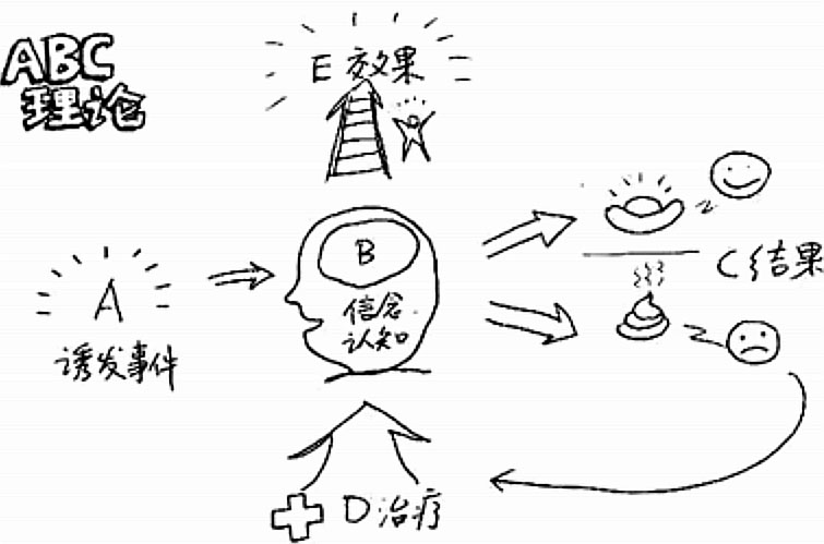 在ABC理论模式中,A(Activating event)是指诱发性事件,B(Belief)是指个体在遇到诱发事件之后相应而生的信念,即人对这一事件的看法、解释和评价,C( Consequence)是指特定情景下,个体的情绪及行为的结果,ABC理论核心是B即信念或观念合理信念会引起人们对事物恰当的、适度的情绪反应,而不合理信念则相反,任何挫折事件均具有两面性,当遇到挫折事件时,多从积极的角度看待问题,人们的情绪和行为反应往往也是积极的。
