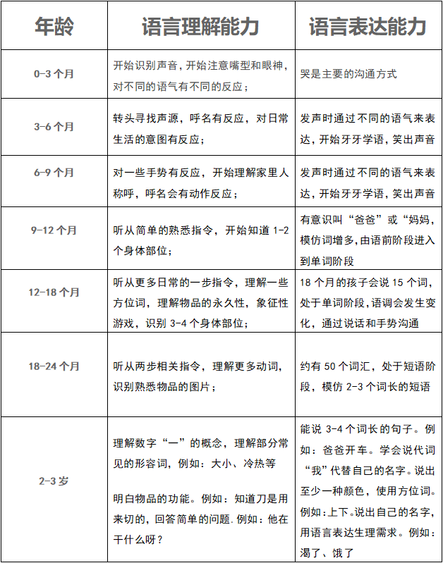 有的家长会问,怎么能知道孩子的语言发育是不是在正常范围内呢?家长可以参考下面的语言发育里程碑家长自查表。